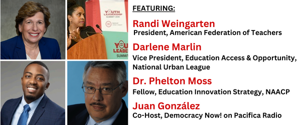 Our panelists will discuss a range of topics across today's major issues in education, culture and community. Moderated by Juan González, Co-Host of Democracy Now!, our panelists will take audience questions live and and discuss how the The Five Demands intersects with the conversations.